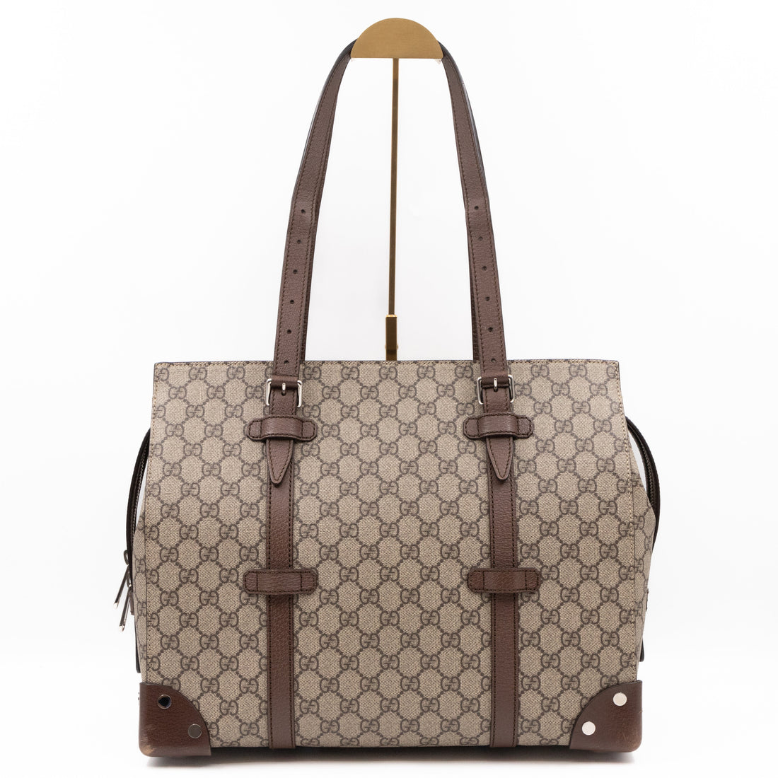 Gucci Buckle Travel Tote GG Supreme Canvas Brown Leather