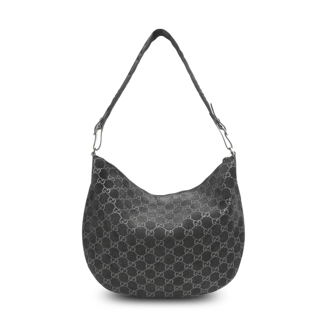 Gucci crescent-shaped hobo bag in black monogram suede leather with black piping. Features top zip...