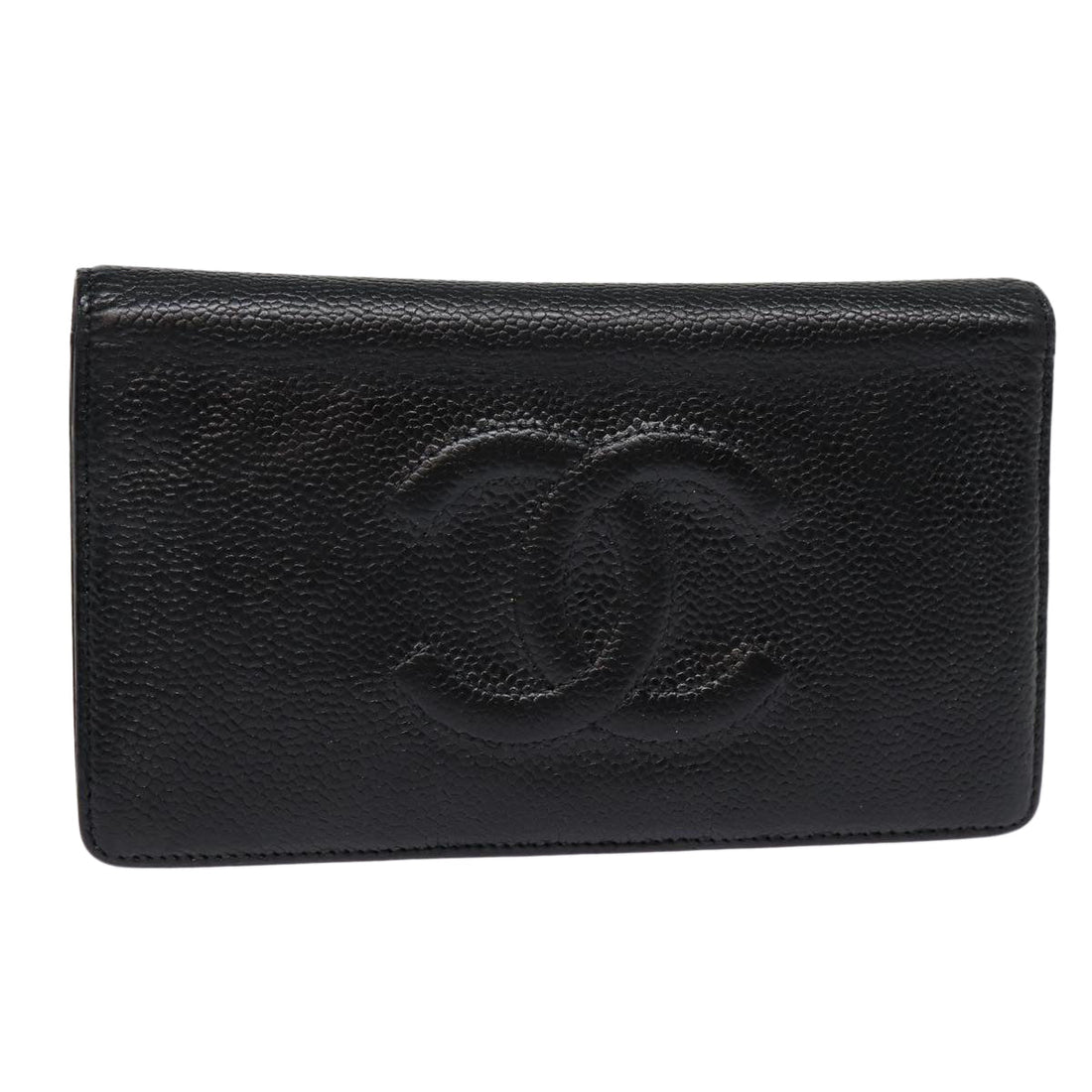 CHANEL COCO Mark Long Wallet Caviar Skin Black Silver CC Auth 88618BRAND : CHANEL Color...
