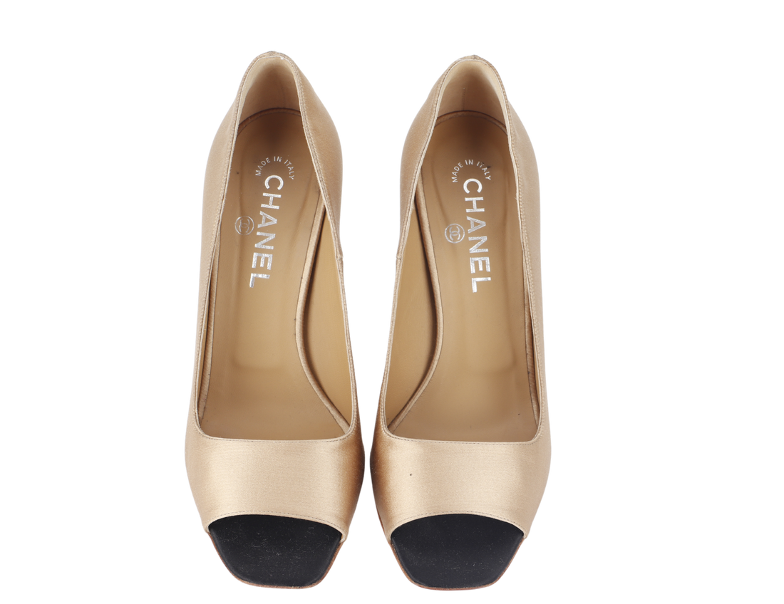 CHANEL OPEN TOE PUMPS BEIGE SATIN LEATHER SIZE 39