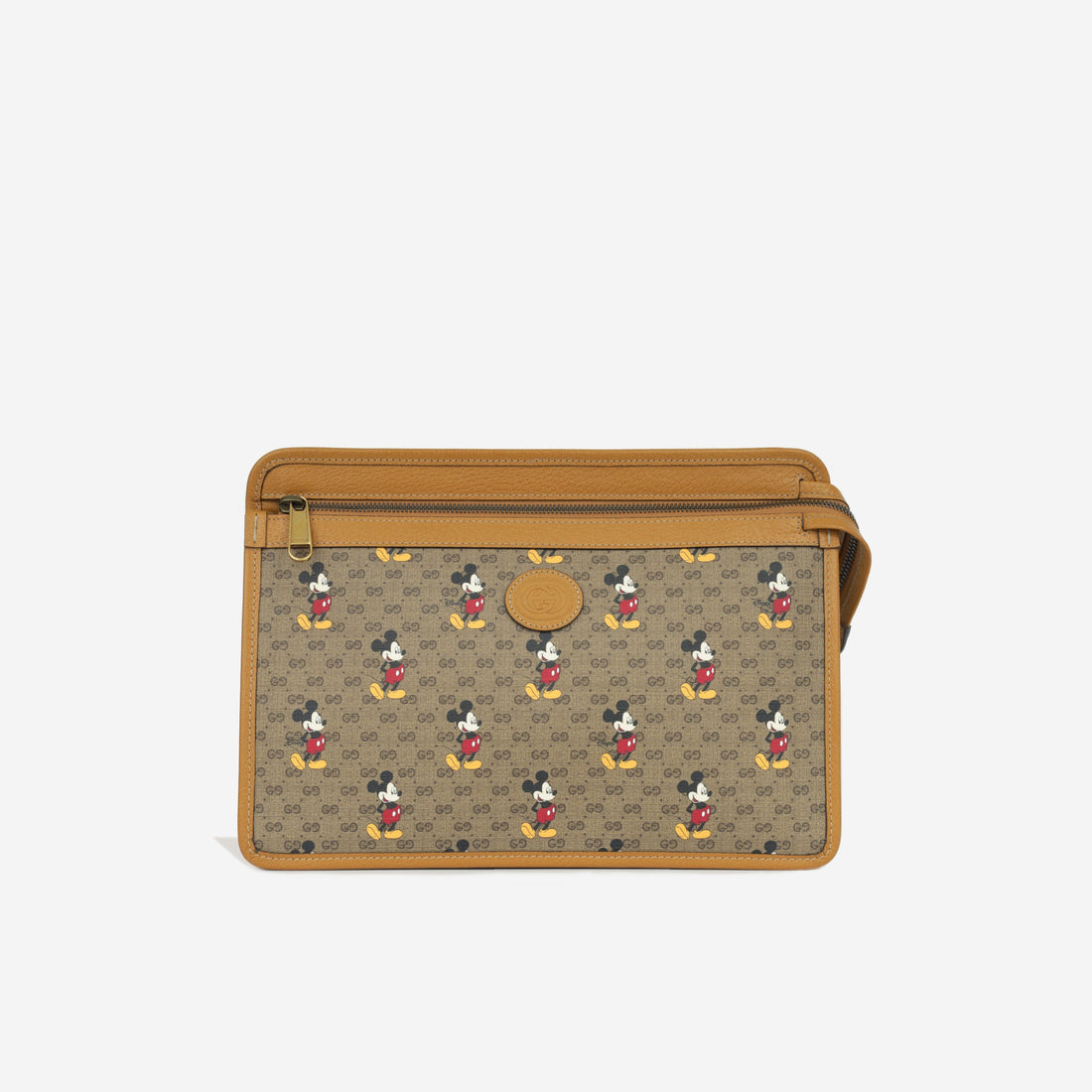 Gucci x Disney Pouch Mini GG Supreme Mickey Mouse pouch accented with brass-tone hardware, tan leather...