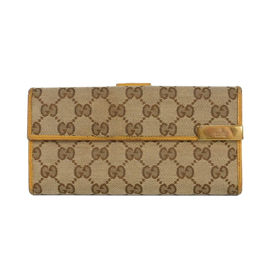 Gucci long wallet in beige 'GG' monogram printed canvas with a tan leather trim, a...