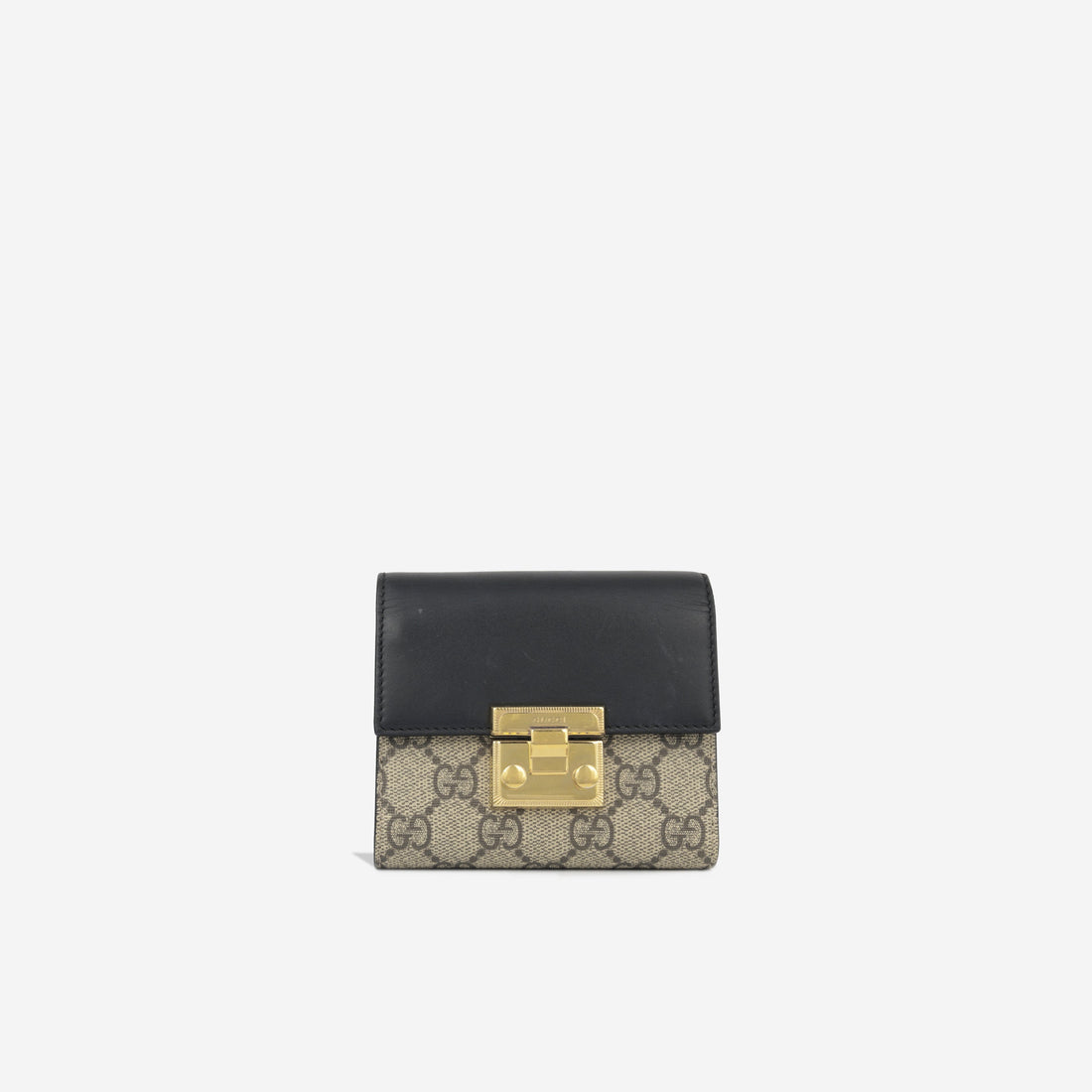 Presenting the Padlock Flat GG Wallet, a stylish accessory designed for both practicality and sophistication....