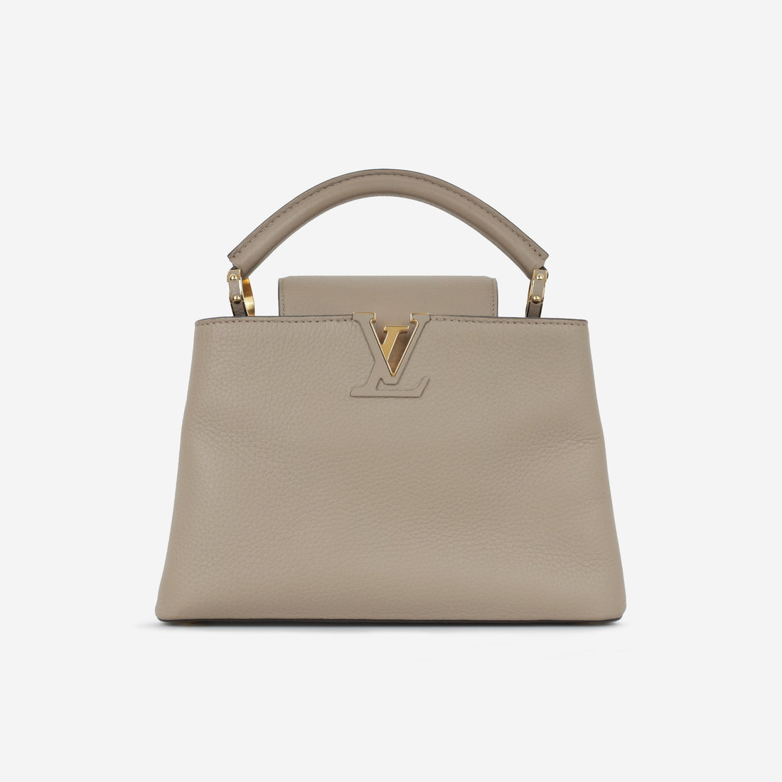 The Louis Vuitton Capucines BB in warm grey-beige (Galet) Taurillon leather with gold hardware is...
