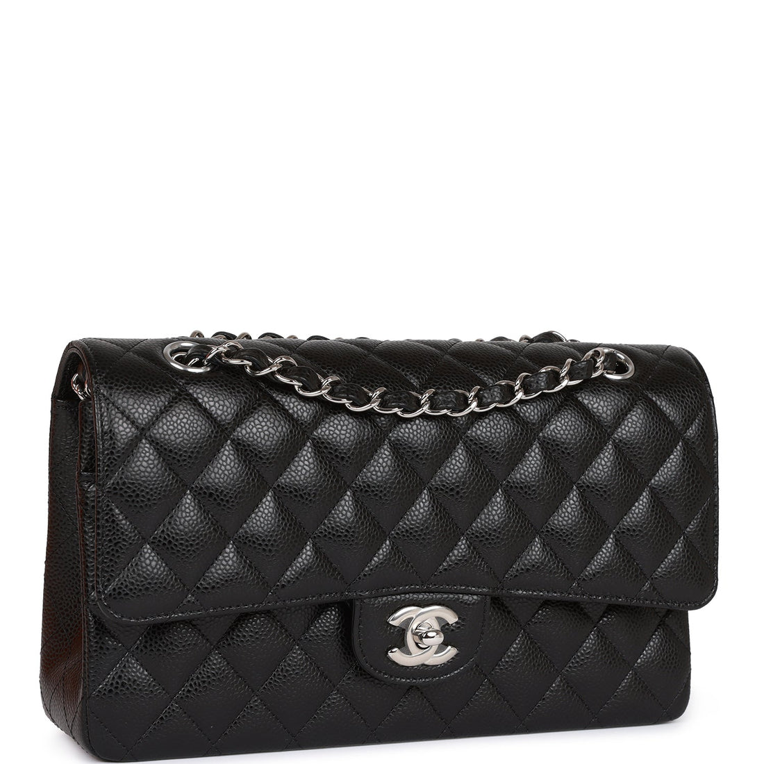 This medium classic double flap bag is in black caviar leather with silver hardware and features...