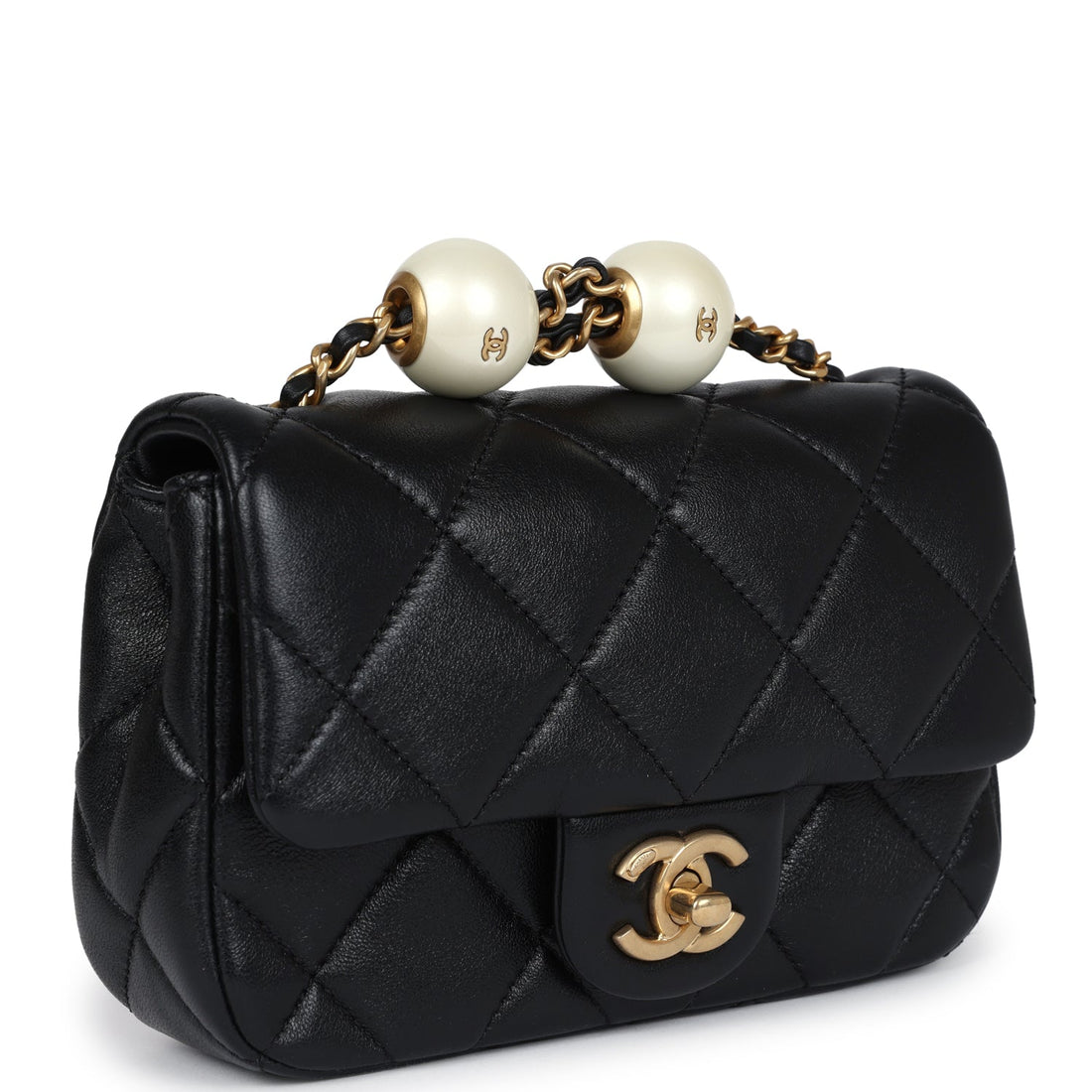 Chanel Mini Square Pearl Flap Bag Black Lambskin Brushed Gold Hardware