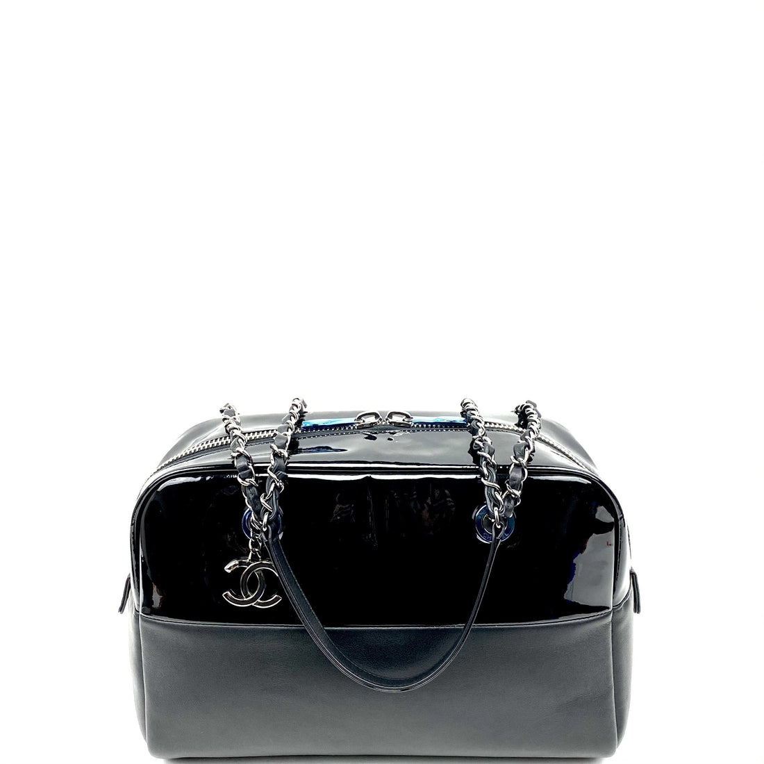 Black Patent & Lambskin leather Chanel Bowling bag with gunmetal hardware, dual chain-link and leather...