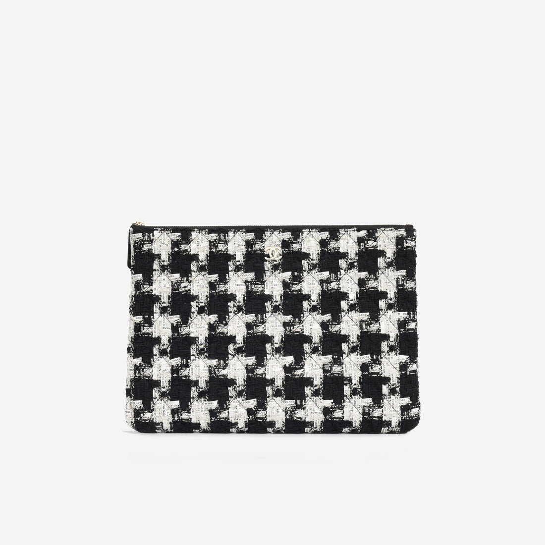 Crafted from a combination quilted black/white houndstooth tweed fabric and black lambskin leather, Chanel presents their...