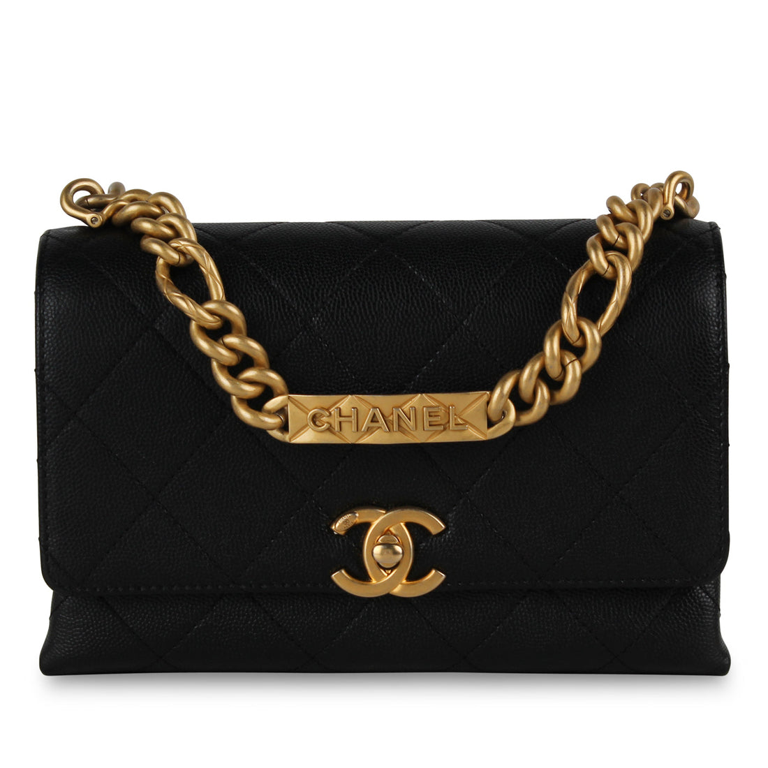 This Chanel School Memory Bag, is in black quilted caviar leather with antique gold hardware, front flap with CC turnlock...