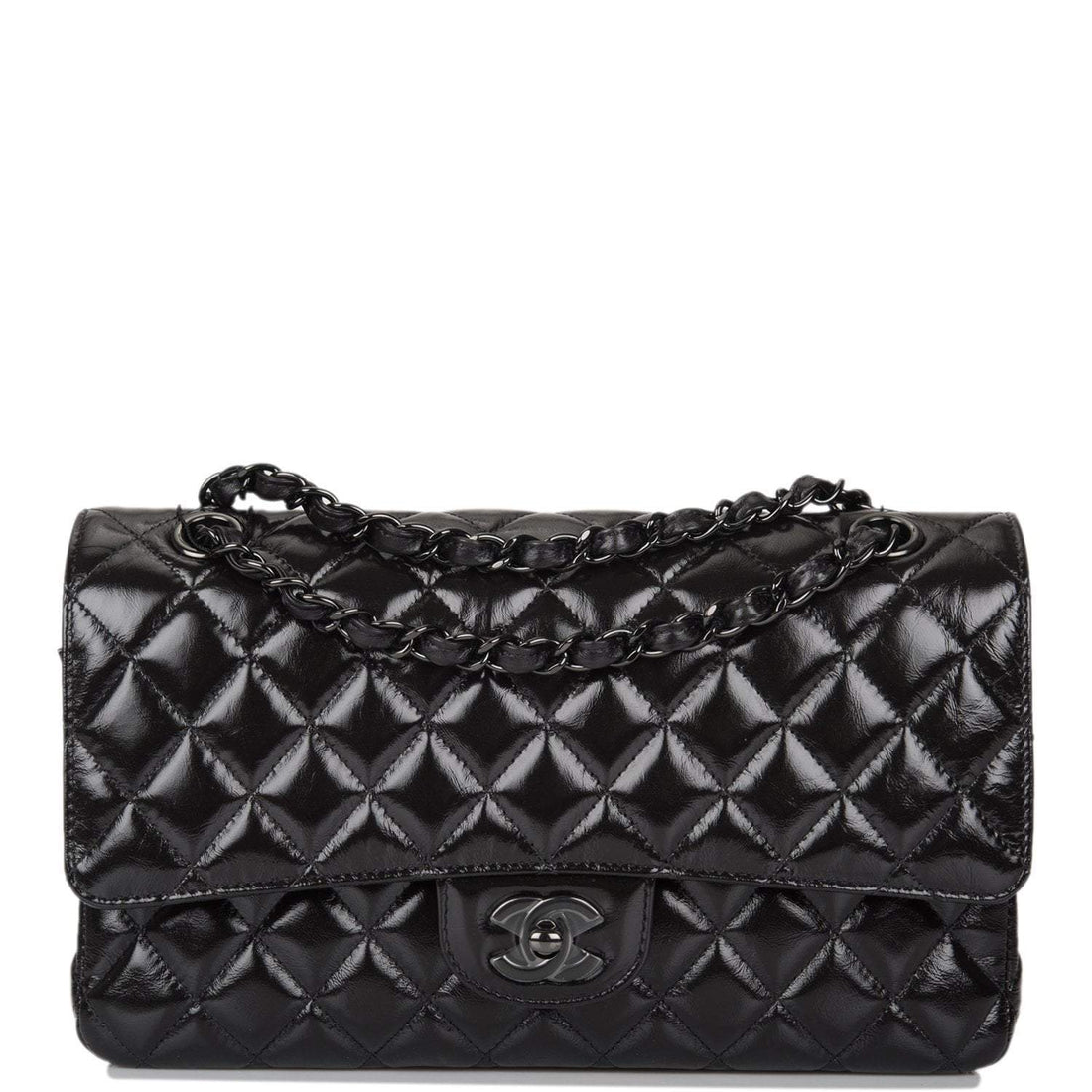 This Medium Classic Double Flap bag is in shiny black crumpled calfskin leather with black...
