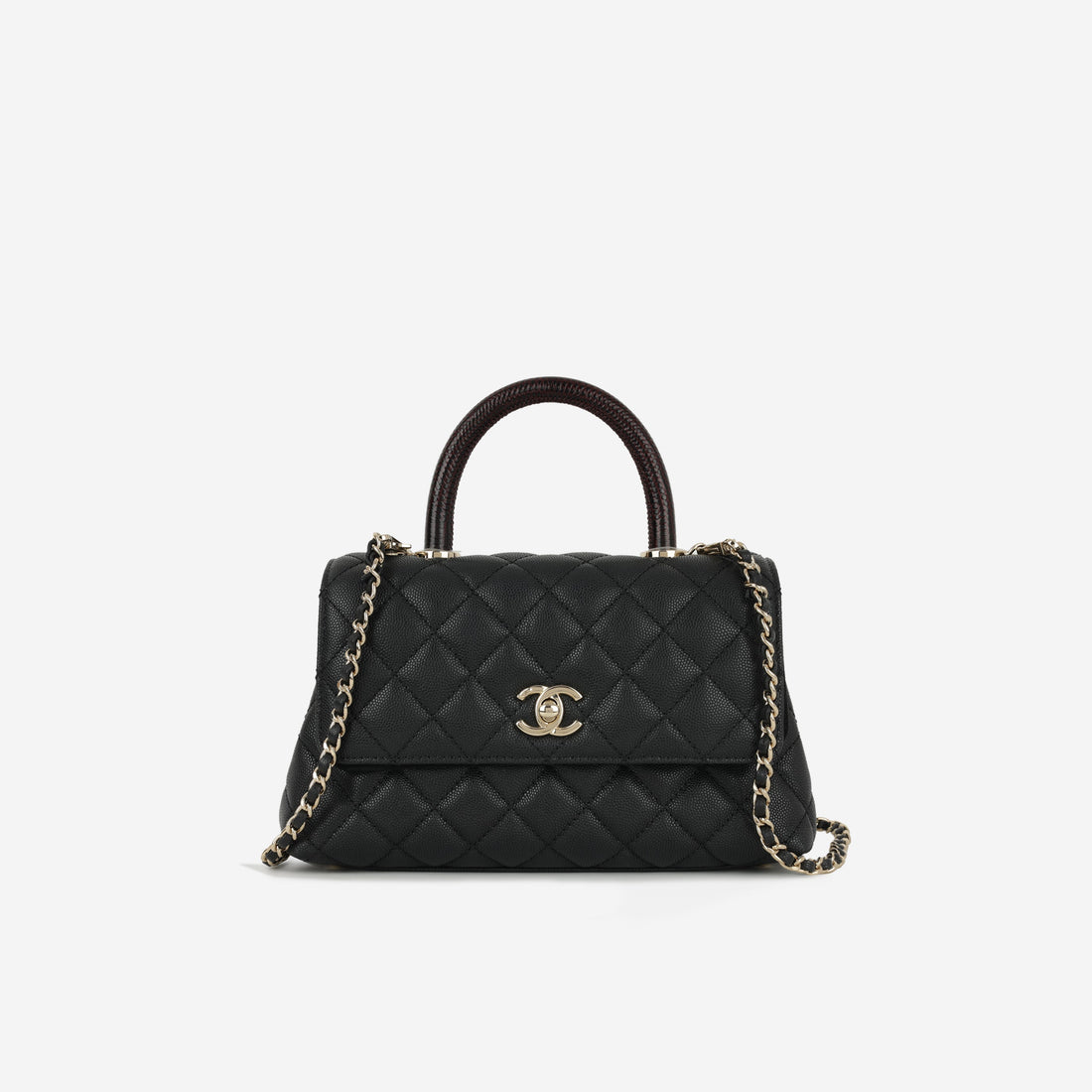 Crafted from quilted caviar leather and a contrasting lizard top handle, Chanel presents the Small Coco Handle...