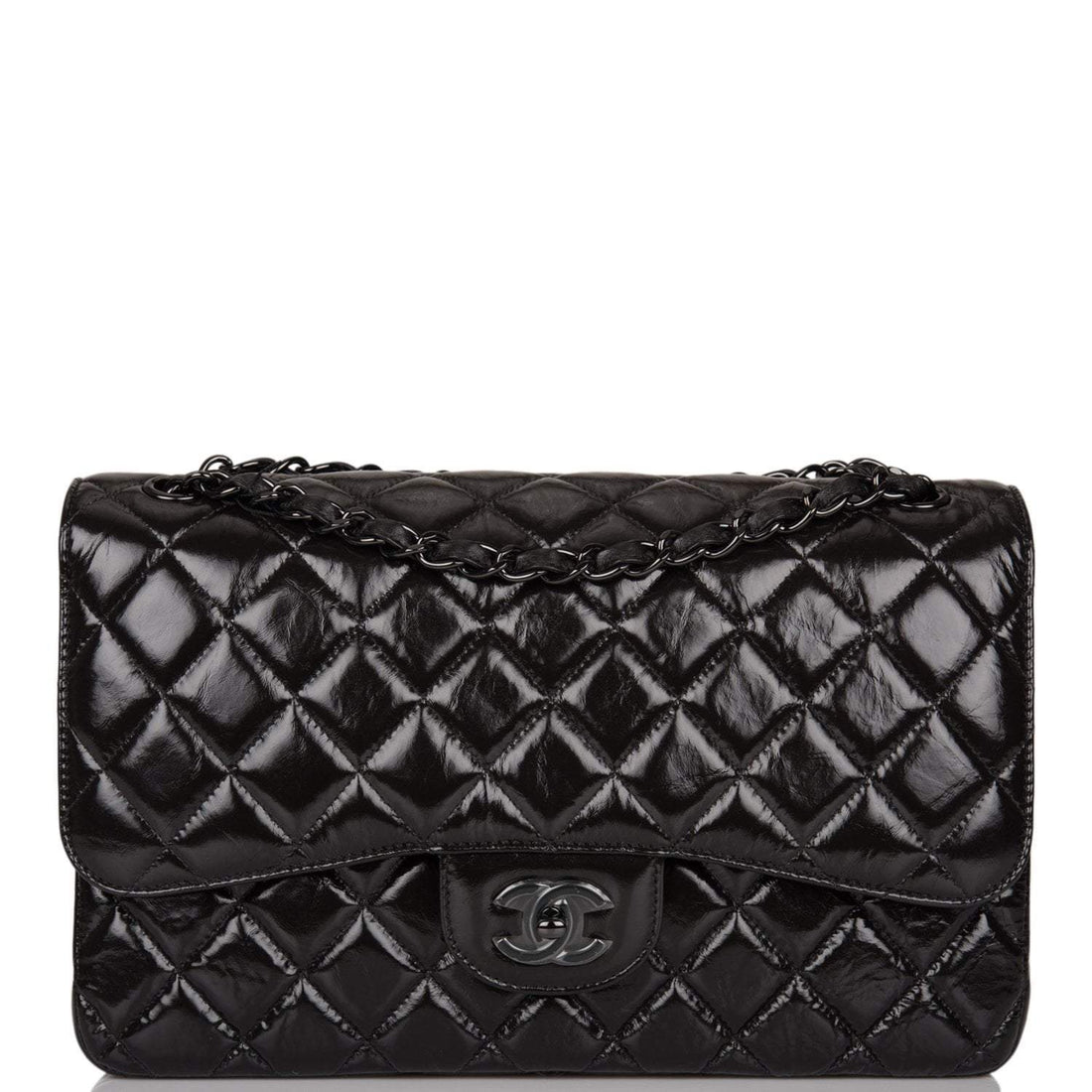 This Jumbo Classic Double Flap bag is in black shiny crumpled calfskin leather with black...