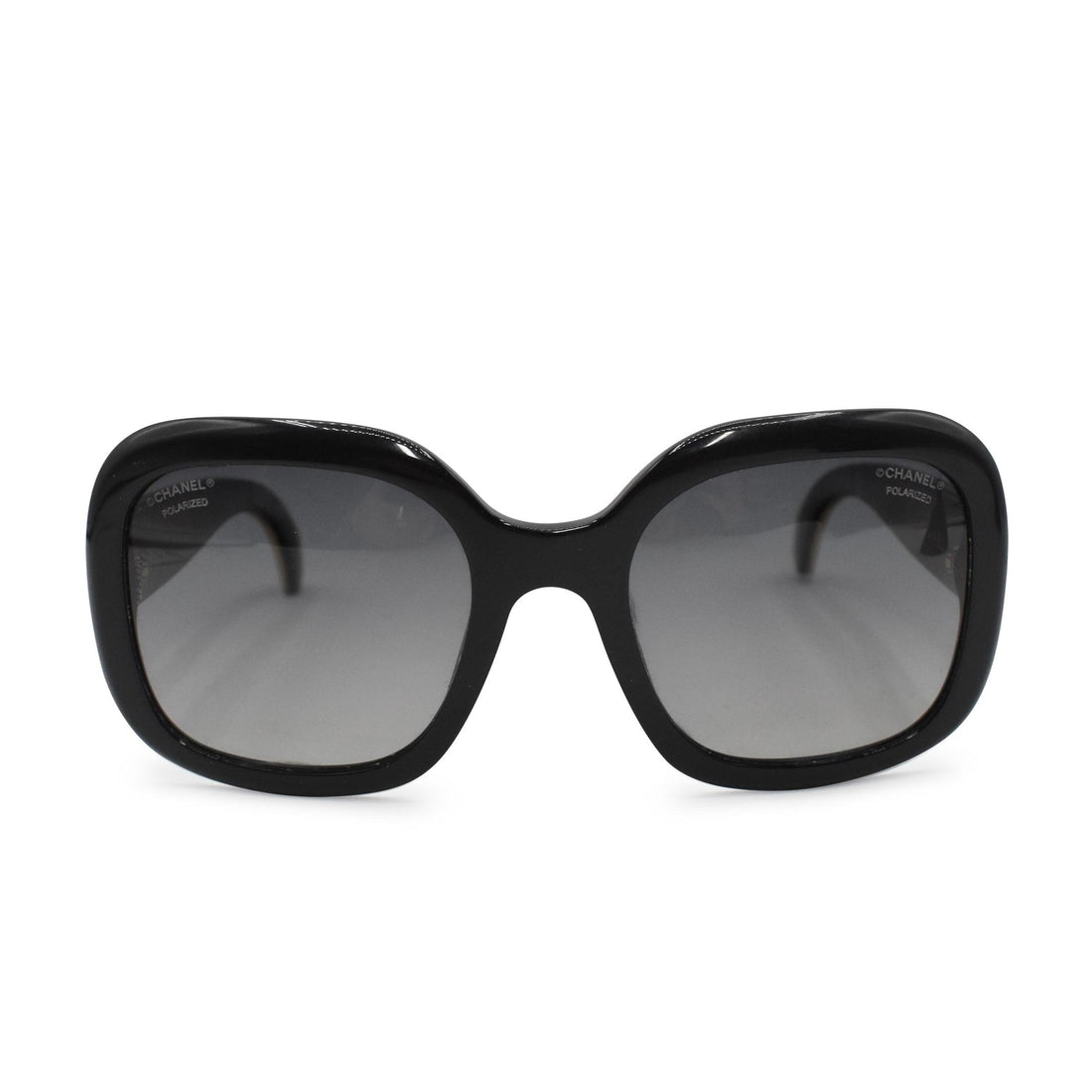 Chanel sunglasses in a rounded cat eye shape with black lenses and black rectangular crystals...
