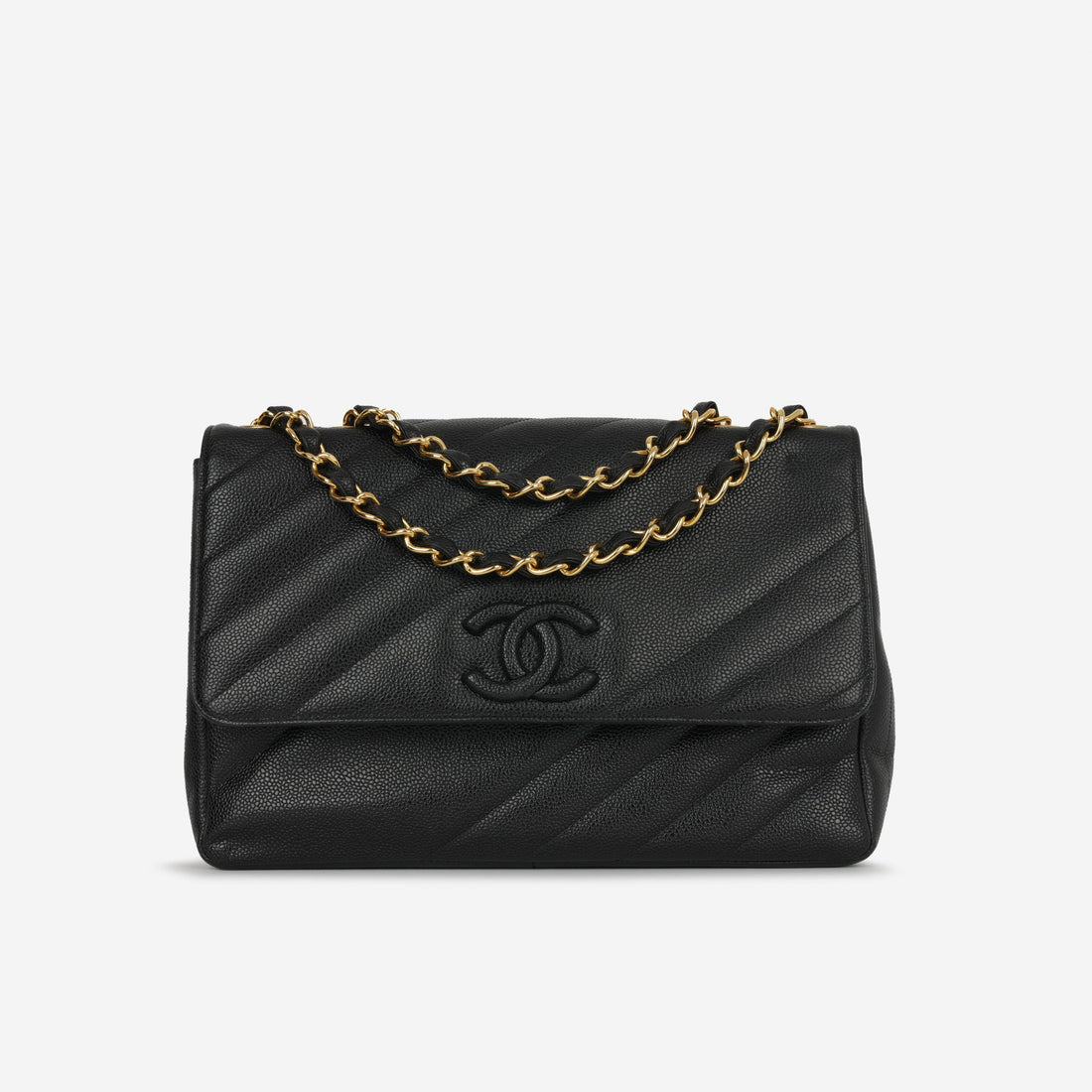 Chanel Vintage Jumbo Diagonal Flap Black Caviar Gold Hardware
