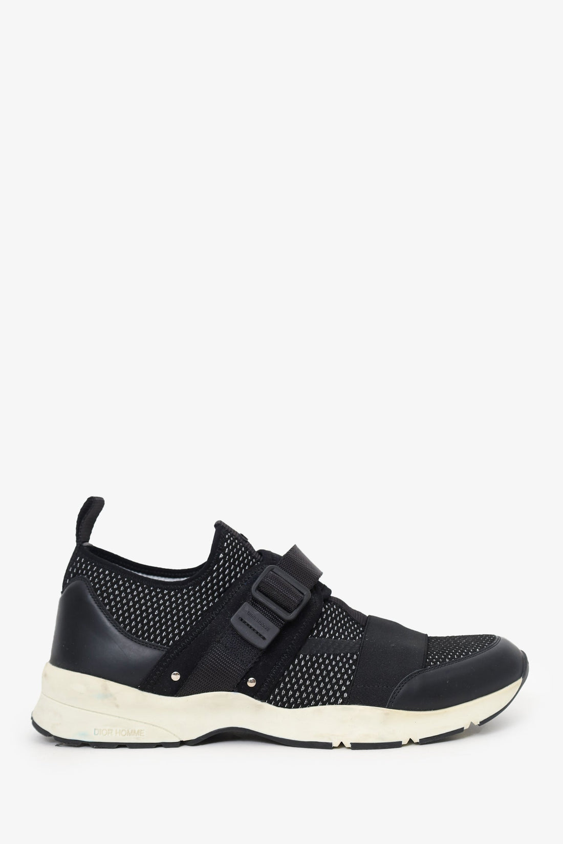 Christian Dior Black/White Buckle Detail Sneakers. Pull-on Round toe. Top velcro closure. Black-tone hardware. Tonal...