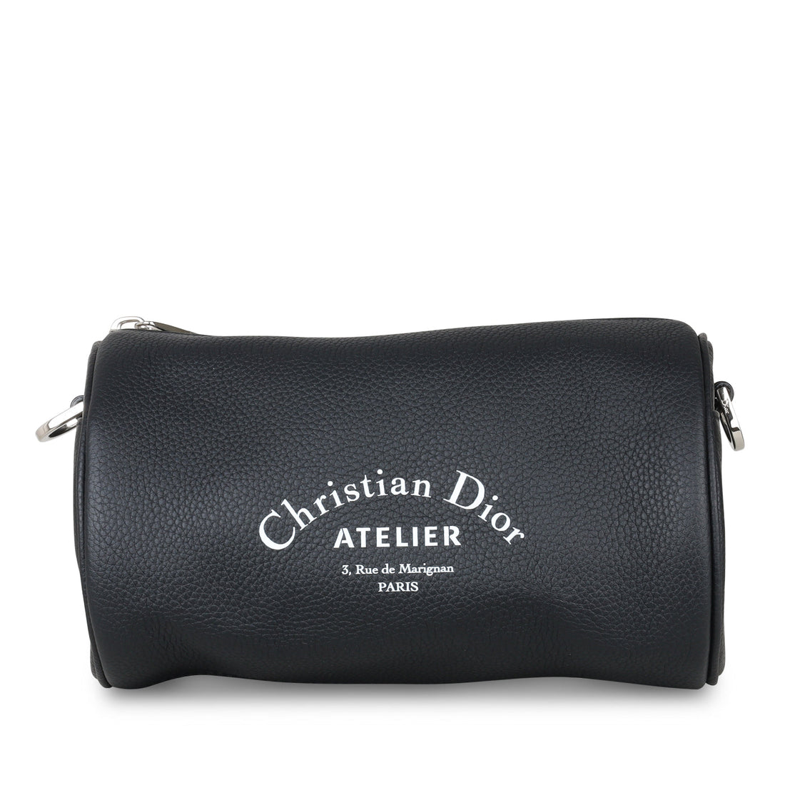 Crafted from grained black calfskin leather and silver hardware and shaped like a cylinder, the...