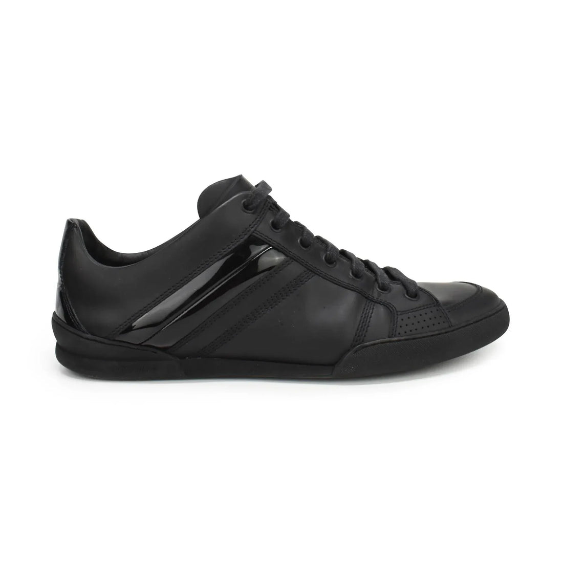 Dior low-top sneakers in black smooth leather with patent leather detailing. Features embossed logo on...