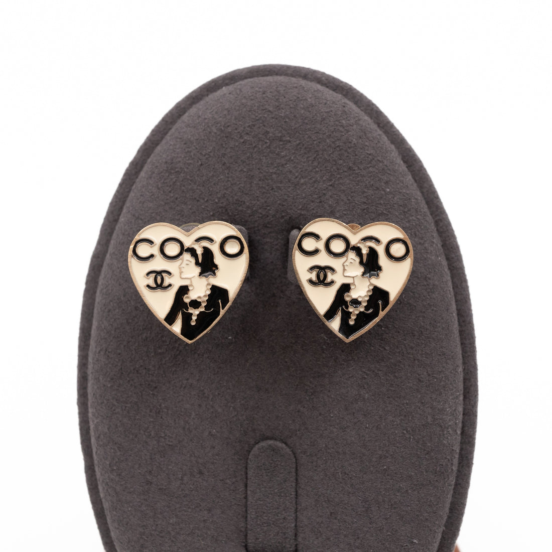 Beautiful Coco Chanel black and white heart clips earrings, with a portrait of intricate design...