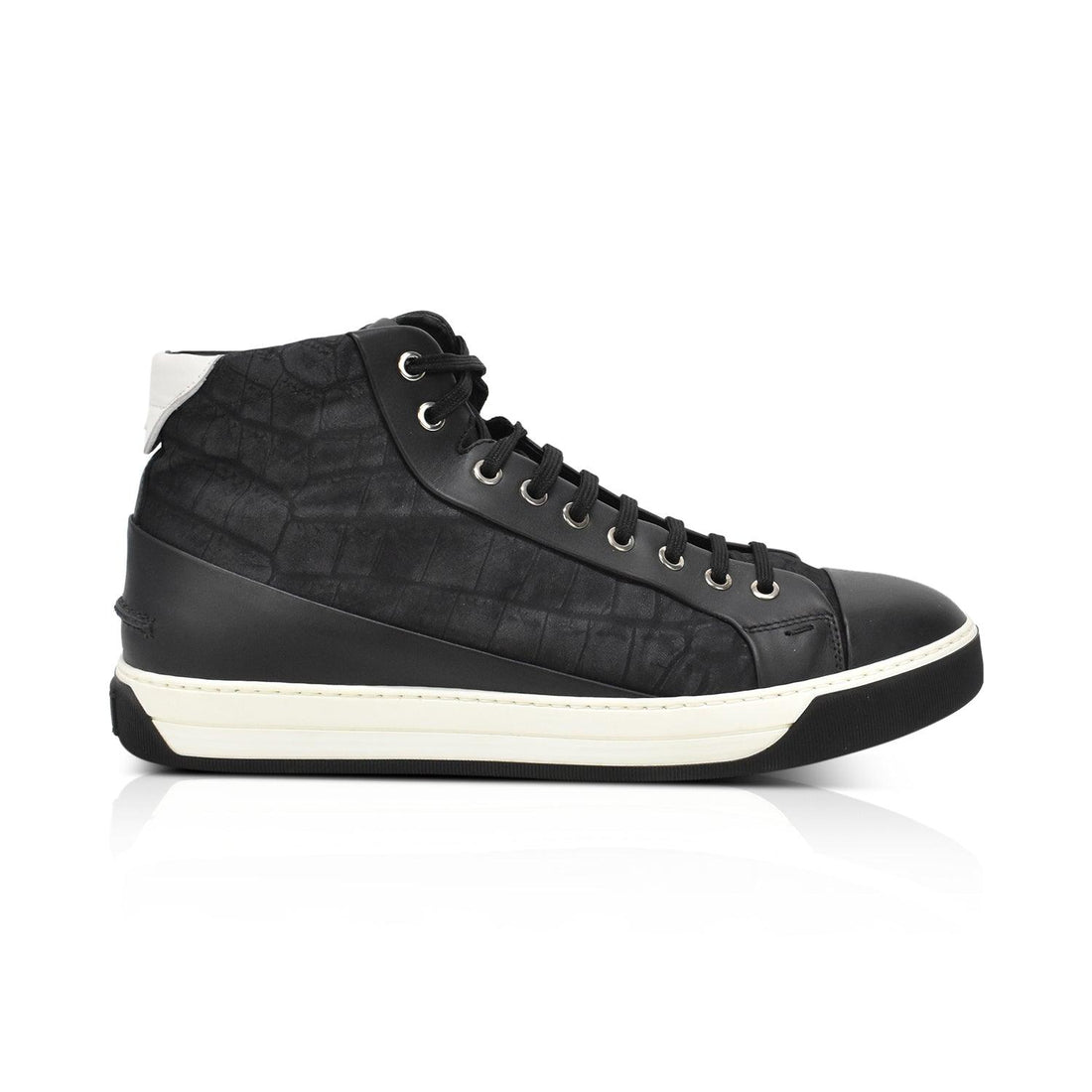 Fendi sneakers in black leather with a white sole, black laces, and a croc embossed suede side...