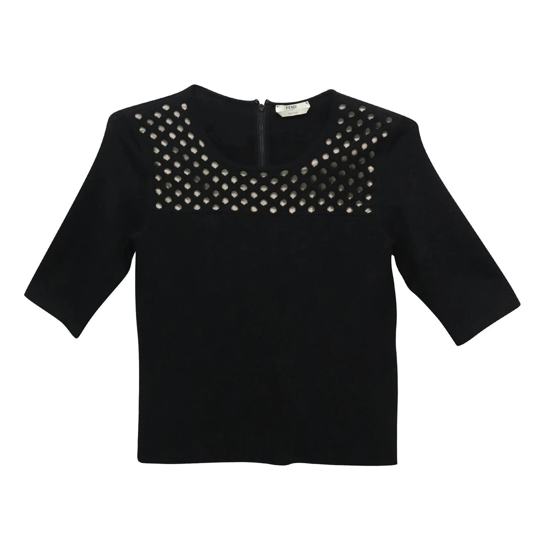 Fendi short sleeve top in black knit with perforated detailing on the chest and nude underlay. Features...