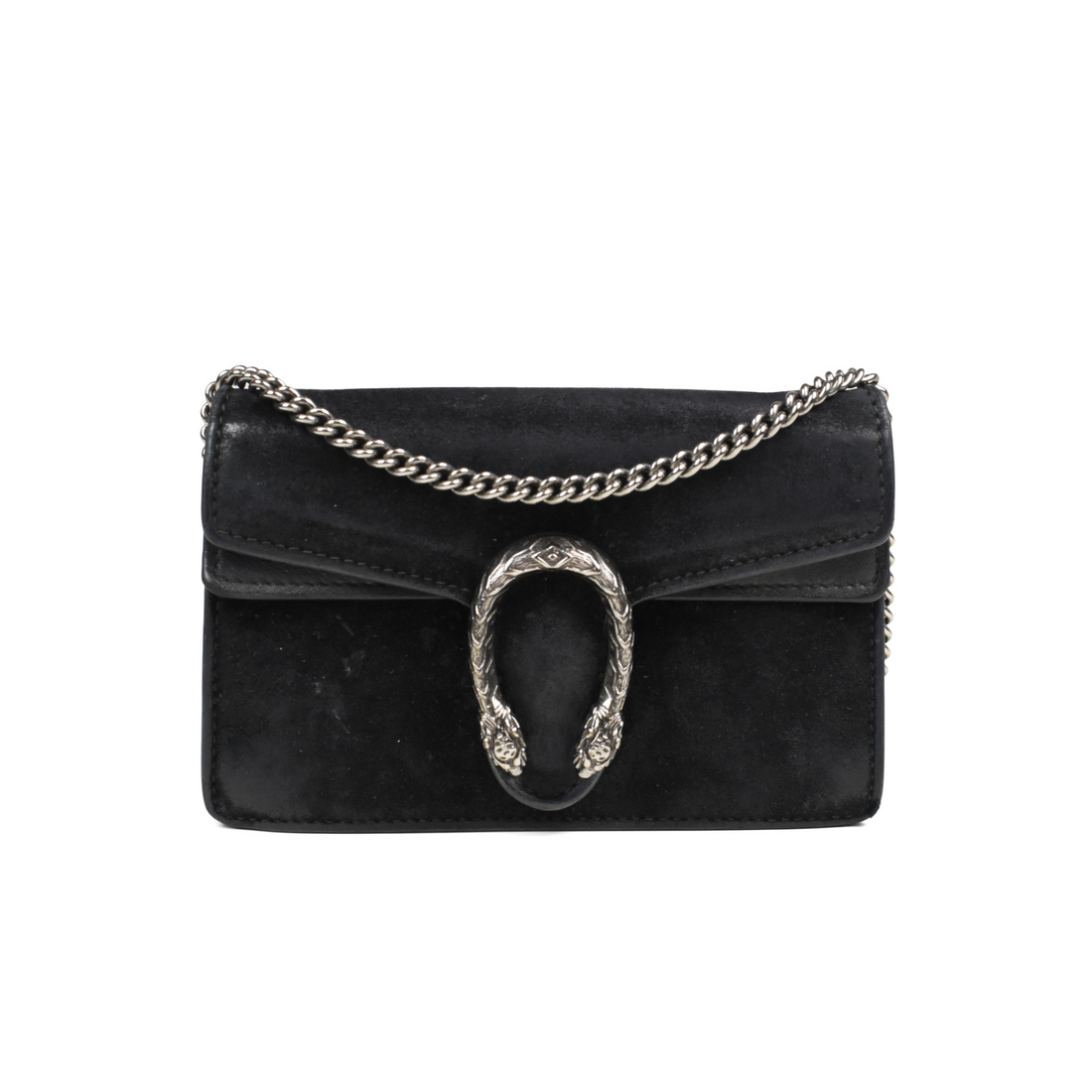 Gucci 'Supreme Mini Dionysus' shoulder bag in black suede with black leather trim. Features a...