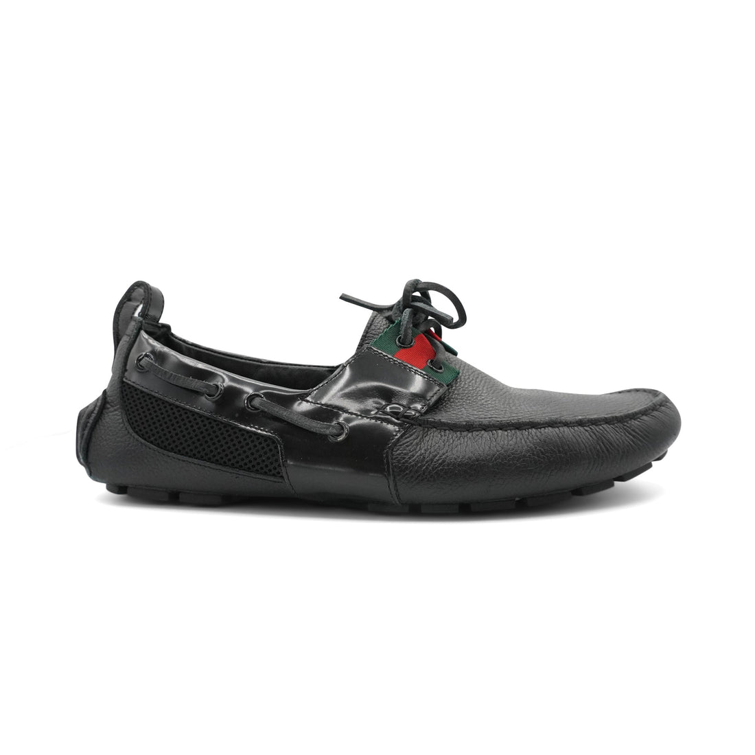 Gucci 'Web' loafers in black grained leather with a patent leather trim, mesh panelling at...