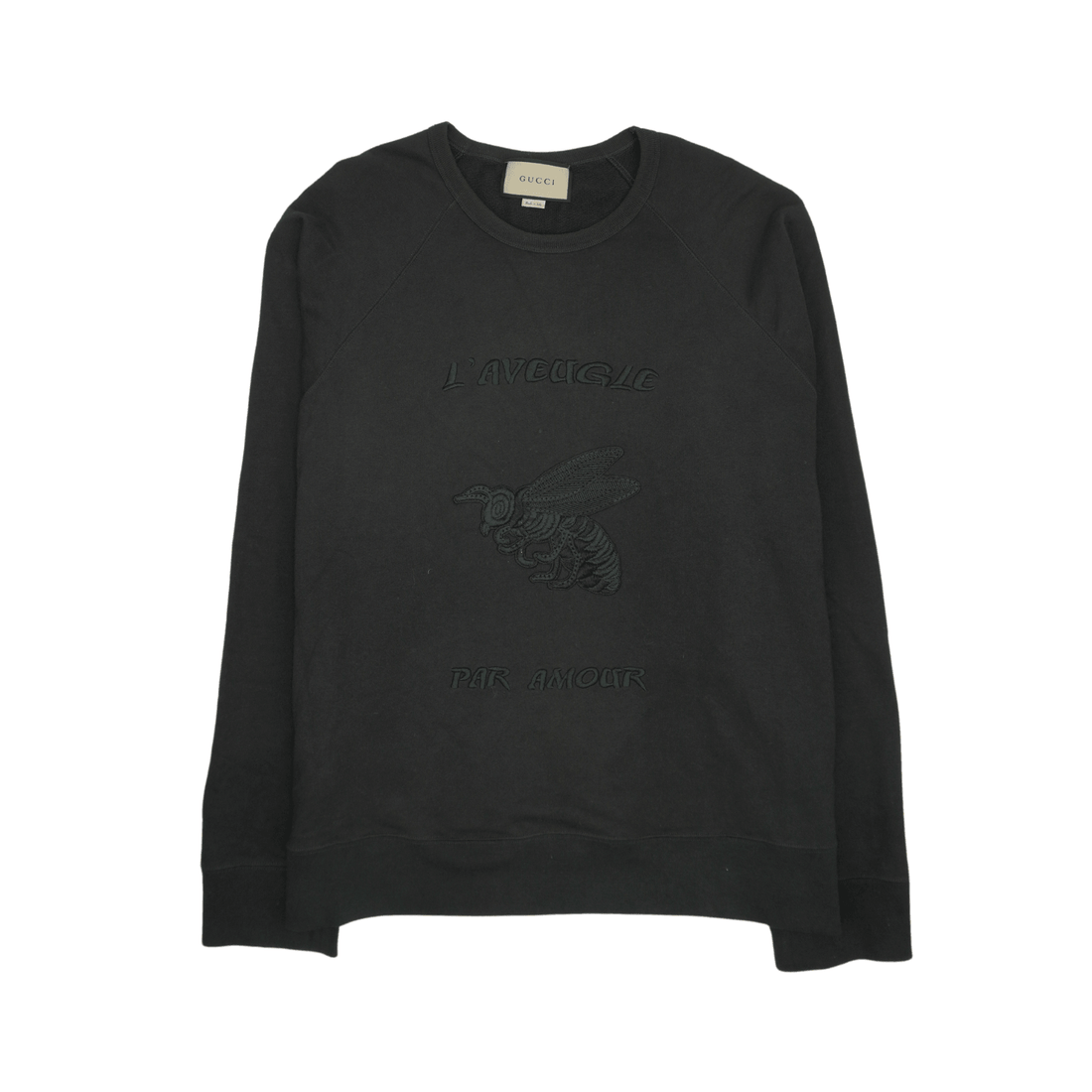 Gucci crewneck sweater in black cotton with a tonal bee and text embroidery on the...