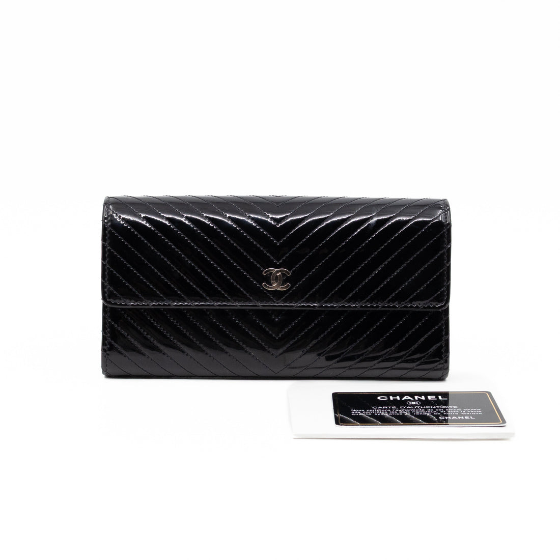 Gusset Long Flap Wallet Chevron Black Patent Leather