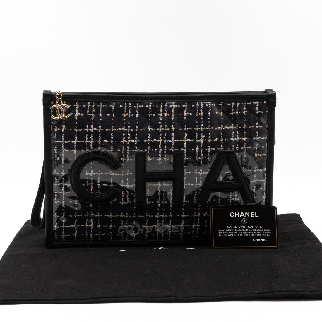 A beautiful Chanel Large Pouch Tweed PVC. Made in black diamond quilted tweed and PVC...