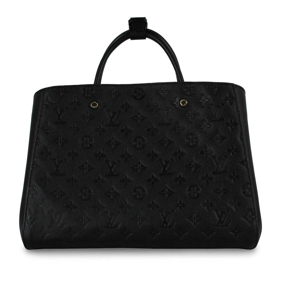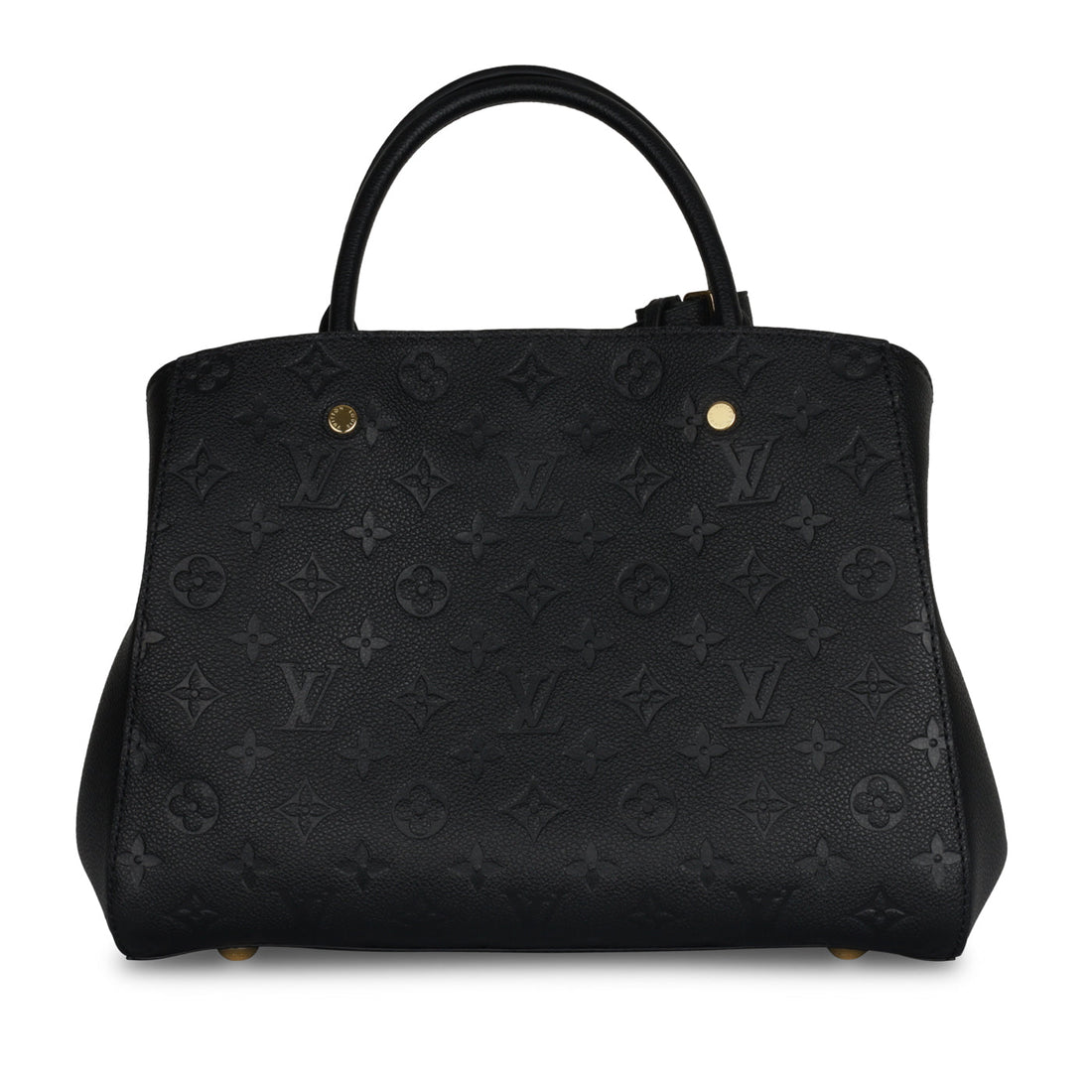 Crafted in black empreinte leather, the luxurious LV Montaigne handbag features dual leather rolled handles,...