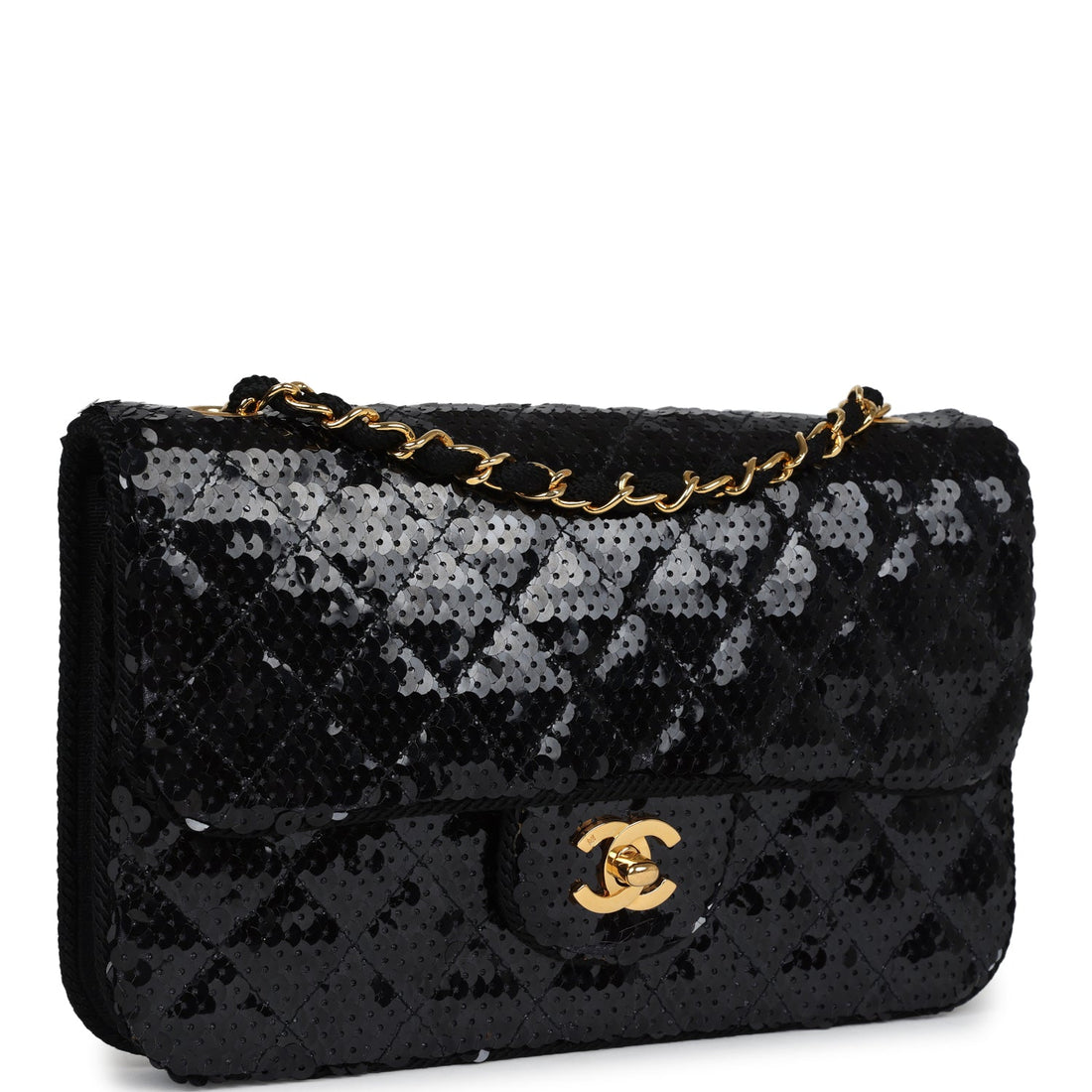 Vintage Chanel Small Flap Bag Black Sequin Gold Hardware