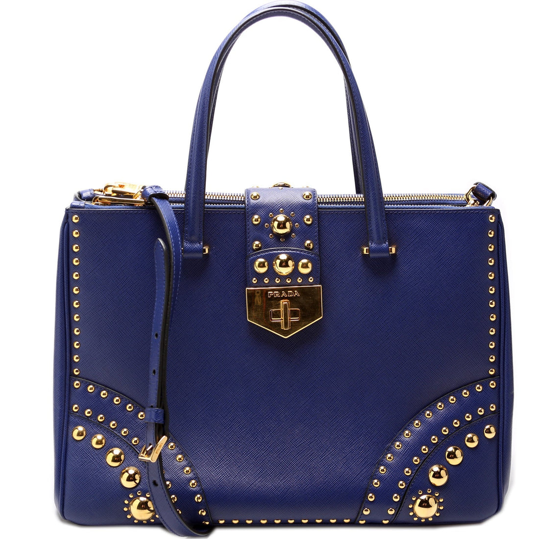 This Prada Saffiano Turnlock Studded Double is d 100% . The exterior is in the classic Prada...