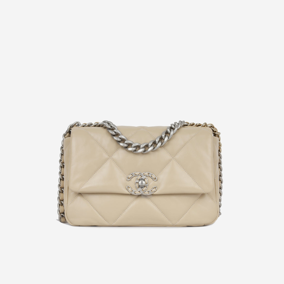 Carefully crafted in Chanel's signature lambskin leather, this stunning Chanel 19 pouch is an absolute...