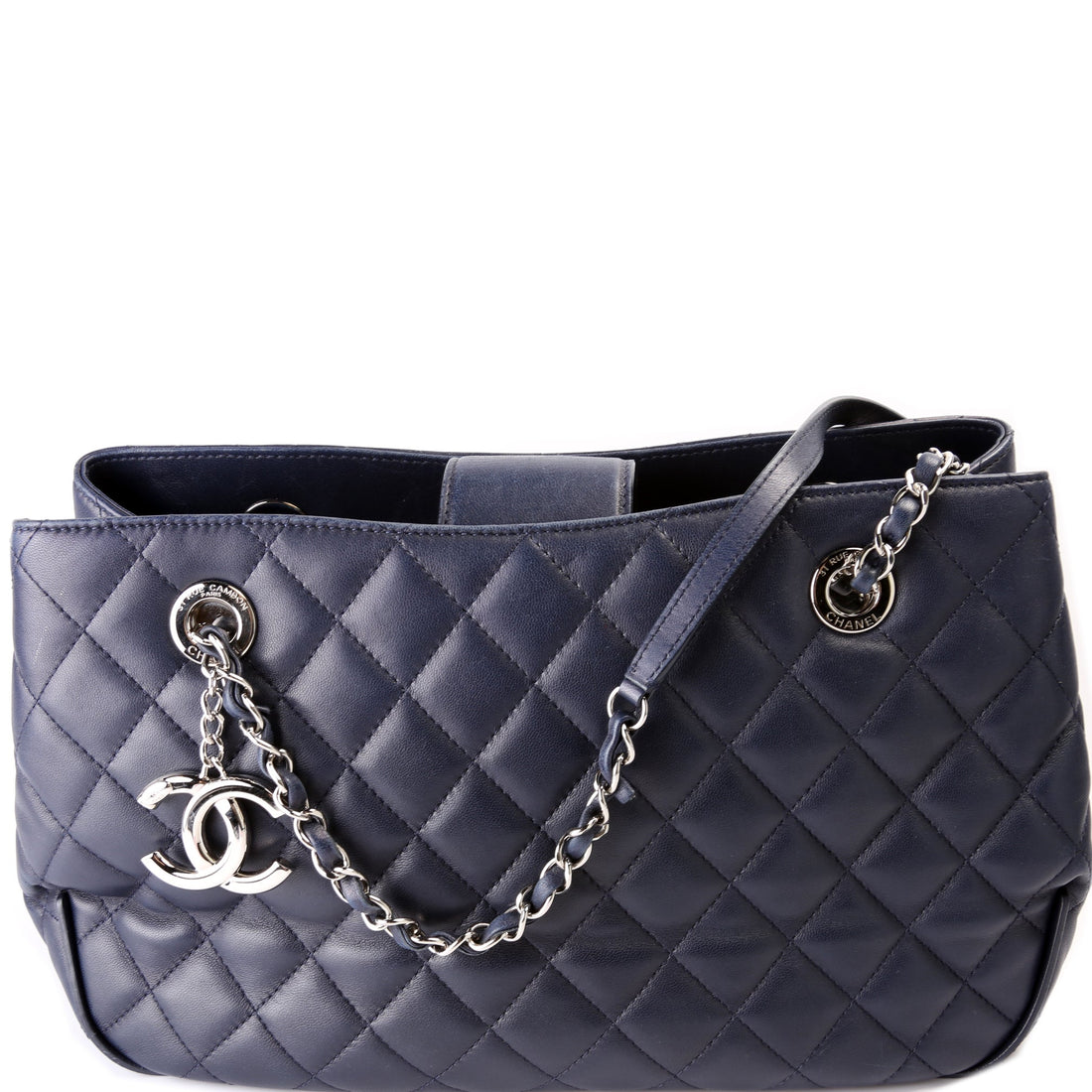 Crafted from navy quilted calfskin leather, Chanel presents their XXL Flap bag. For those that...