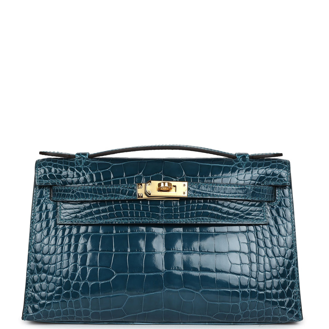 Hermes Kelly Pochette Vert Bosphore Shiny Alligator Gold Hardware