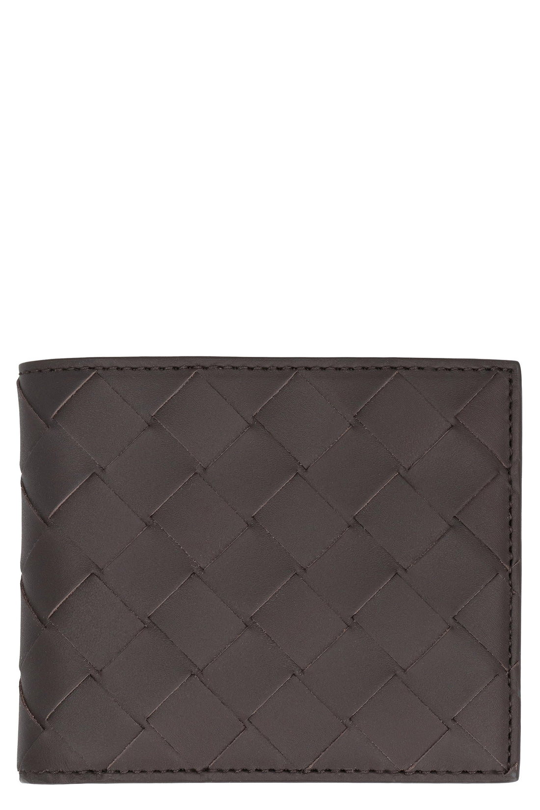 Elegant leather wallet featuring a classic Intrecciato motif Secure snap button closure Convenient zippered coin...