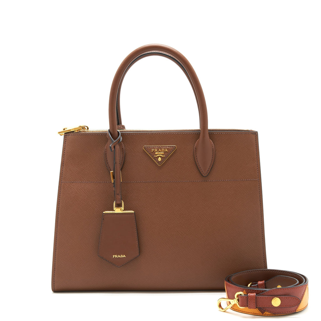 This stylish Prada Saffiano leather tote bag in brown featuring double top handles and the...