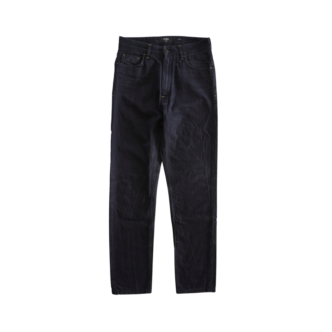 Fendi tapered jeans in black denim with yellow stitching and a stylized yellow, white, and...