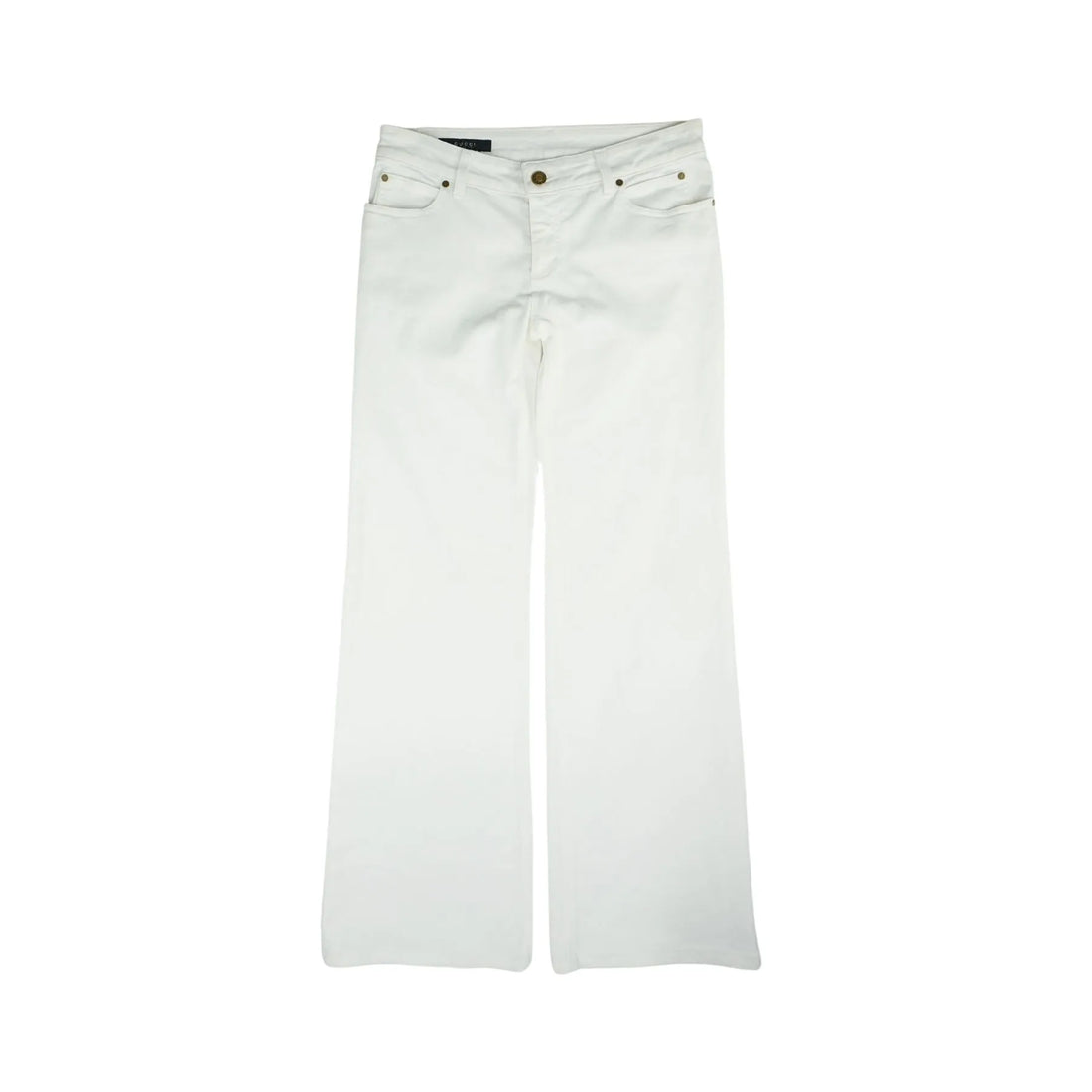 Gucci wide-leg jeans in white denim. Features a gold beaded cursive 'G' on the back...