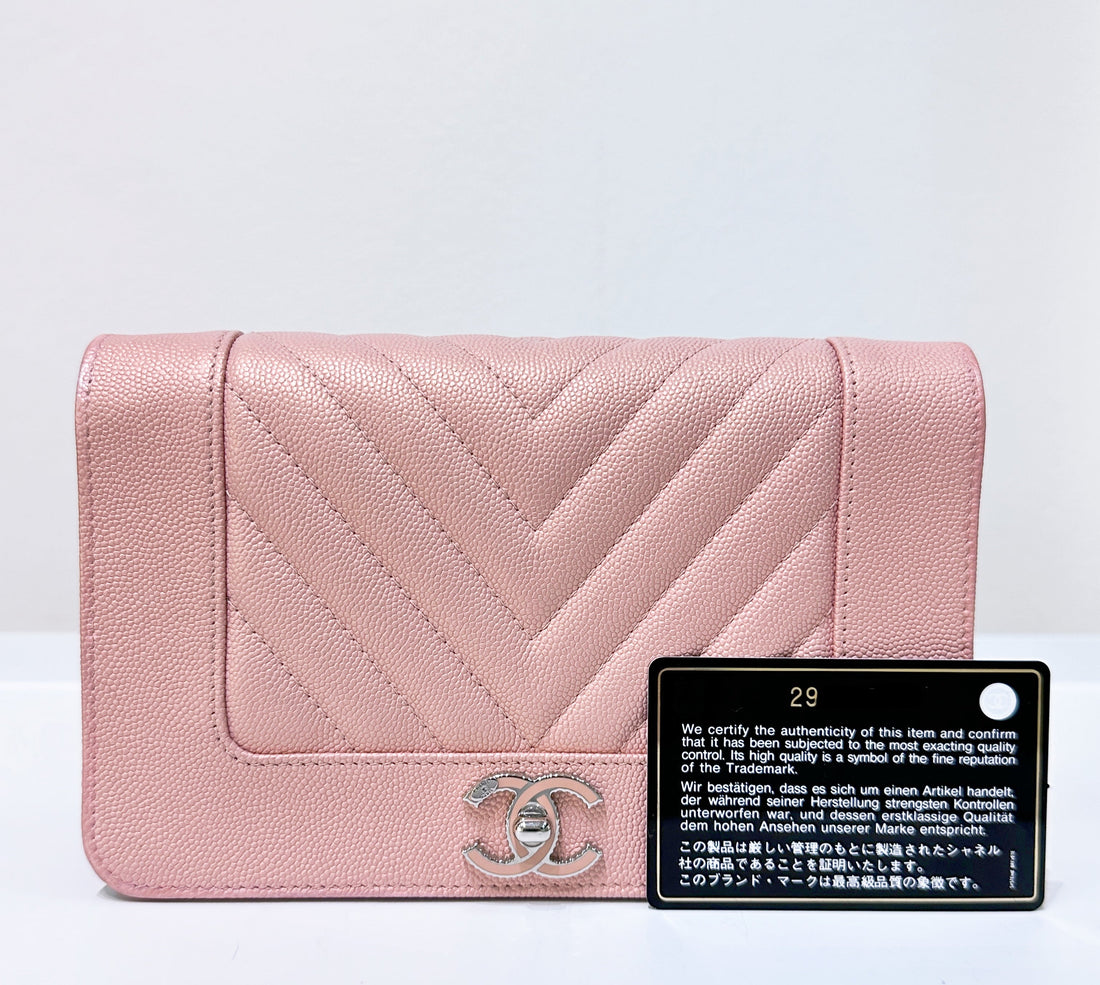 CHANEL Metallic Caviar Chevron Quilted Vintage Mademoiselle Wallet On Chain WOC Pink