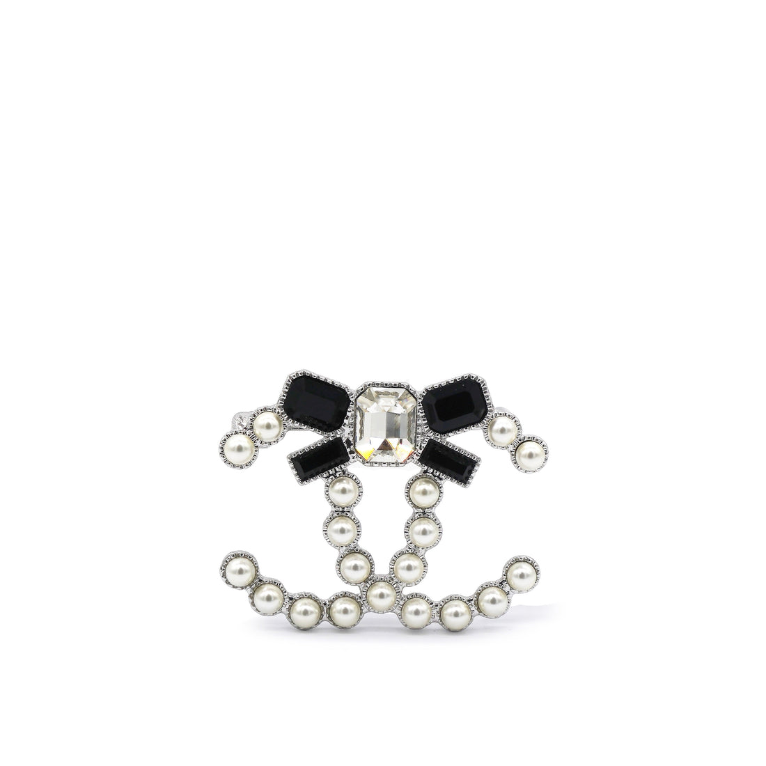 Chanel Pearl Crystal Bow CC Brooch Silver White Black