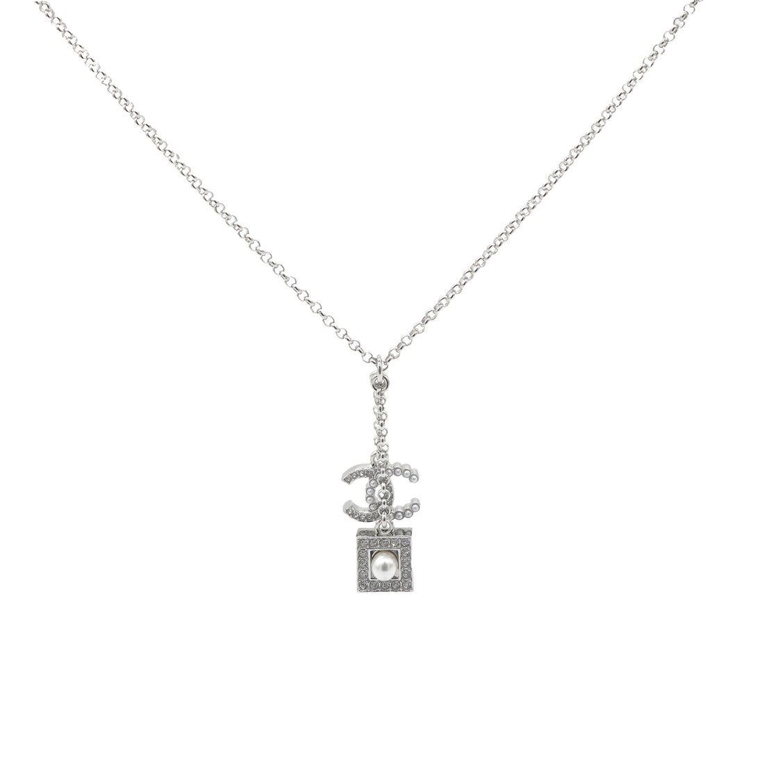 Chanel Pearl Rhinestone CC Logo Square Pendant Silver Pendant Necklace