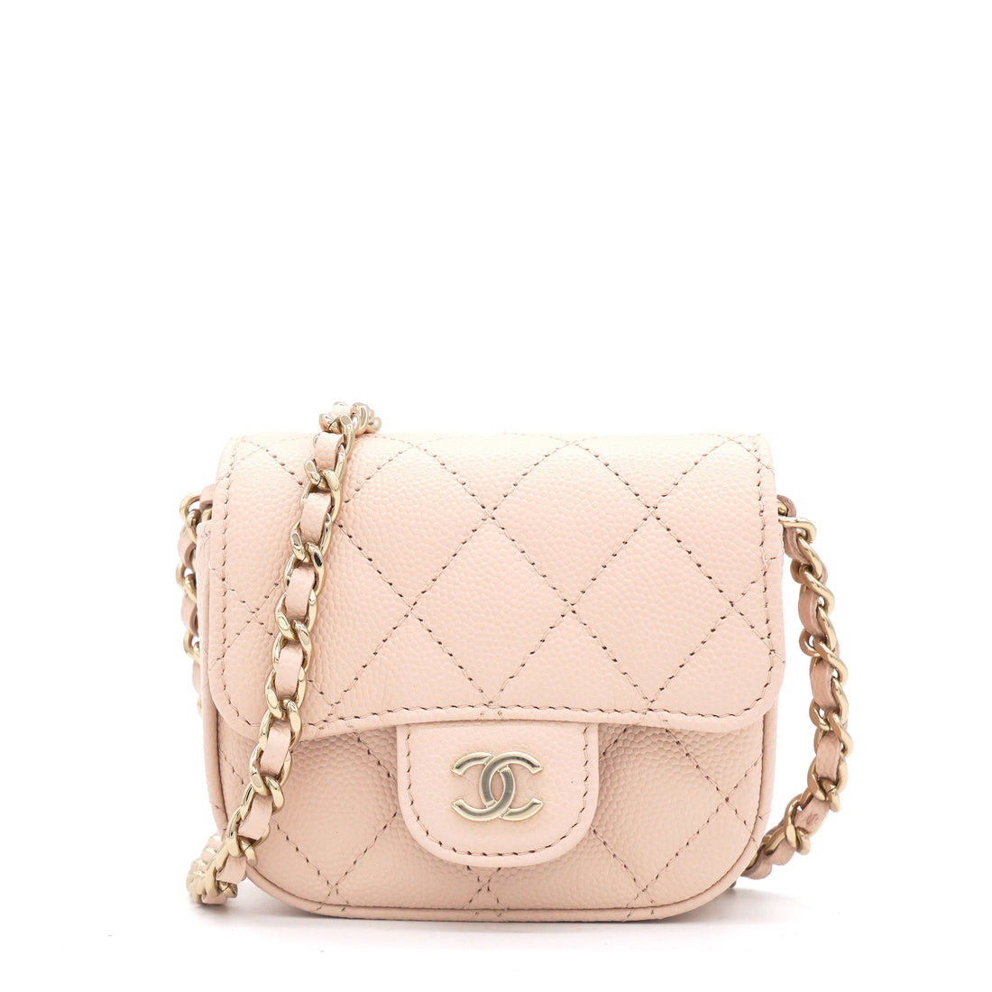 Chanel Pink Beige Quilted Caviar Leather Flap Card Holder with Belt Chain