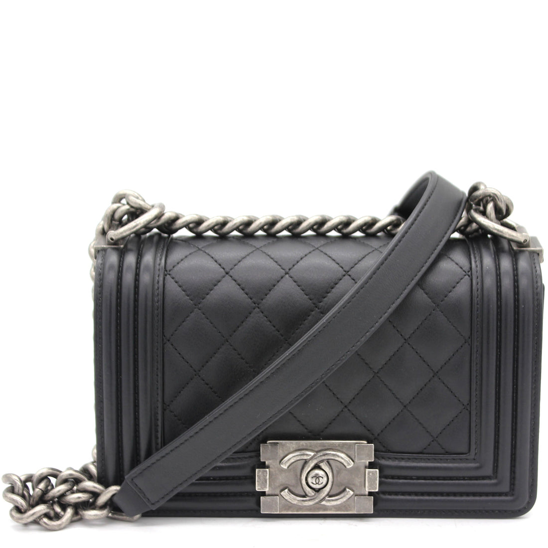 Black double-stitched quilted leather Chanel Medium Boy Bag with silver-tone hardware, convertible chain-link shoulder strap...