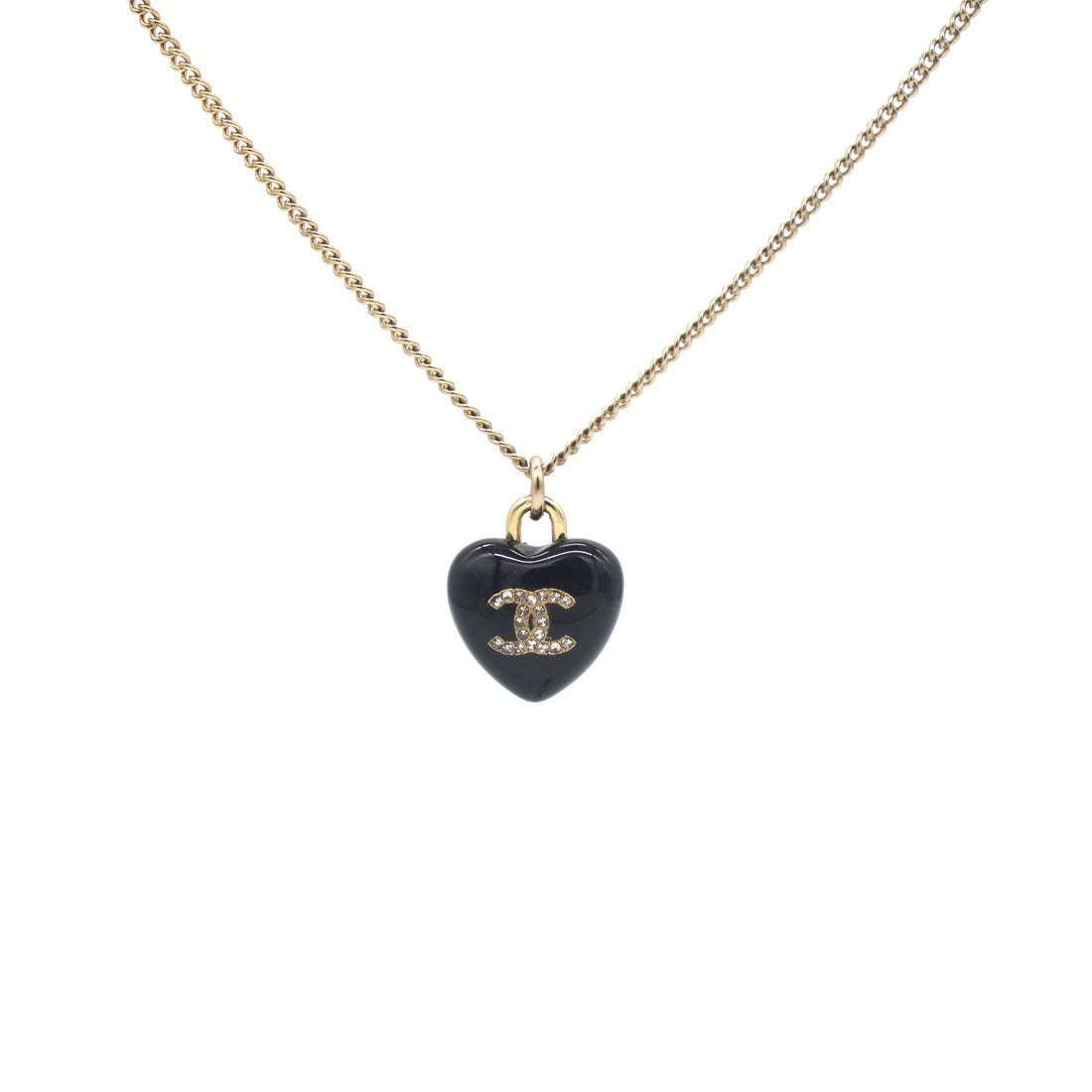 Chanel Resin Crystal CC Heart Necklace Black Gold