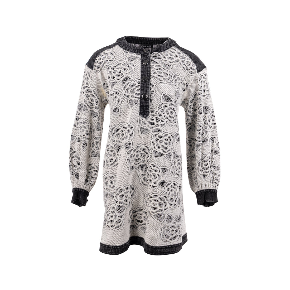 Chanel Size 34/36 Camellia Hollow-Out Denim Dress Cotton/Paper White/Black