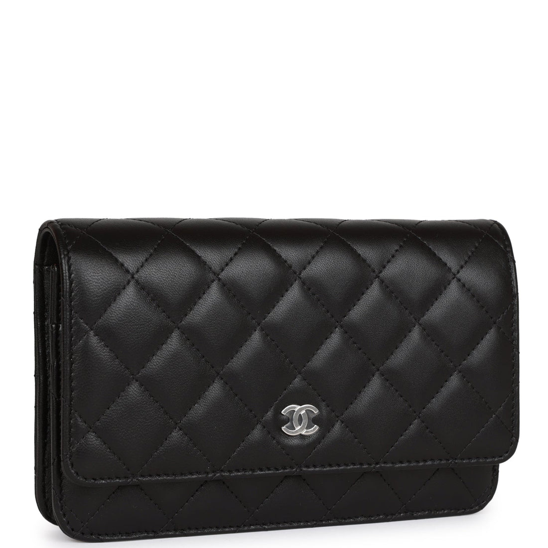 This Wallet on Chain is of black caviar with silver tone hardware and has a front flap with CC...