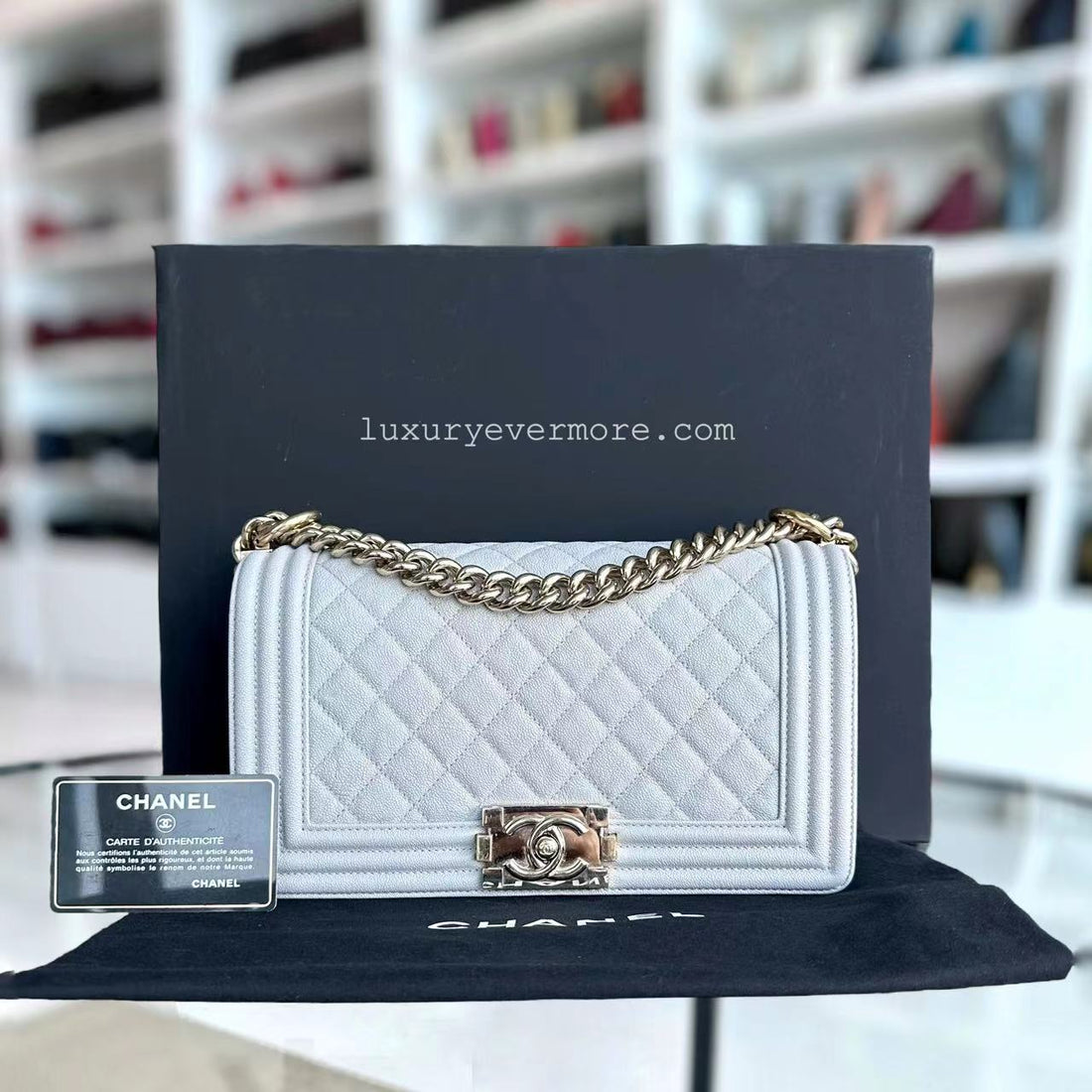 Caviar Boy Old Medium 25CM Quilted Grained Calfskin Light Grey Gray Golden Hardware Series 28