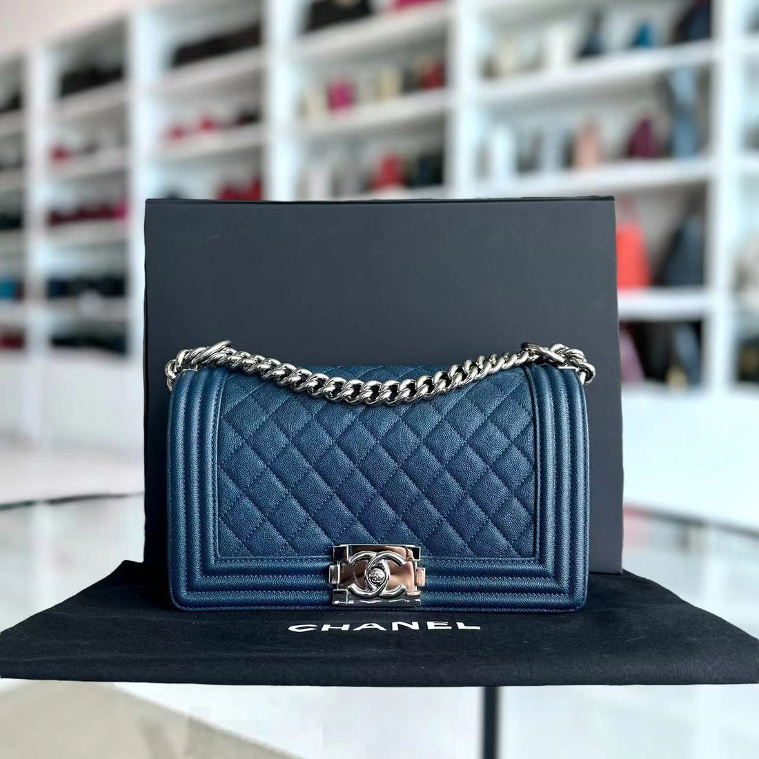 Caviar Boy Old Medium 25CM Quilted Grained Calfskin Blue Leboy Silver Hardware Series 28
