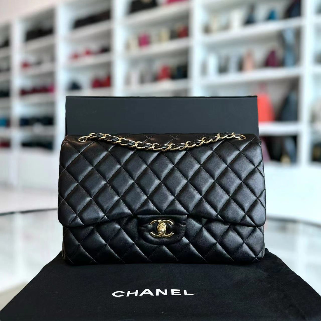 Jumbo Double Flap Classic Flap Quilted Lambskin Black Golden Hardware Series 22